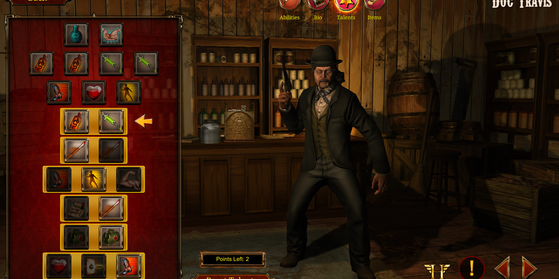 Doc Travis is one of our more interesting characters. You might assume he’s a healer and you’d be right. However, Doc has a darker side and you can pick talents and configure him as a melee killer who uses his scalpel and toxins to give his enemies a fatal prescription. It’s your choice about how you want to play Doc.